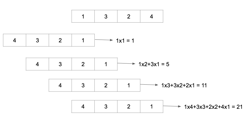 You fix the first sequence and reverse the second sequence, sliding it one element at a time while computing dot products. For instance, multiplying corresponding elements and summing them gives: