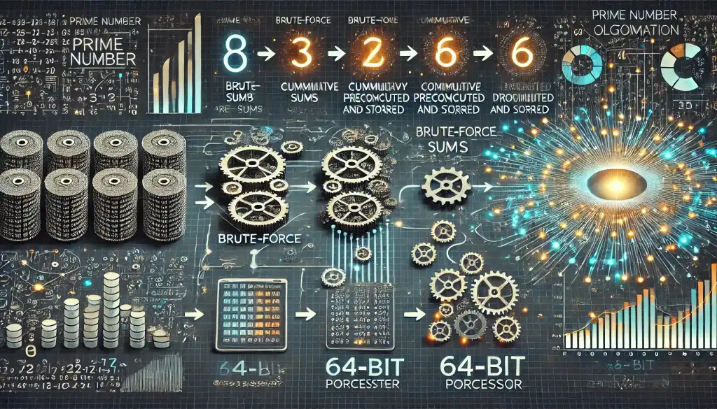 However, several issues arose. As I was storing the cumulative sum of primes from the first prime up to the current one, I found that a 32-bit integer variable was insufficient. Therefore, I used 64-bit integers to store the cumulative sums of the primes.